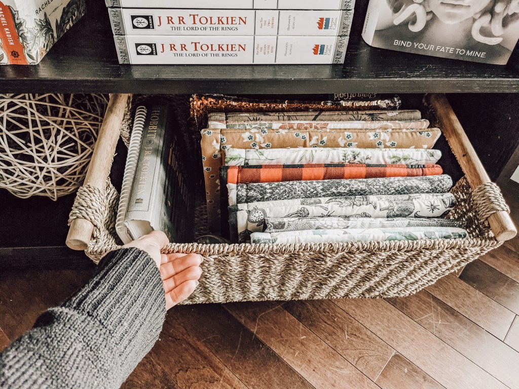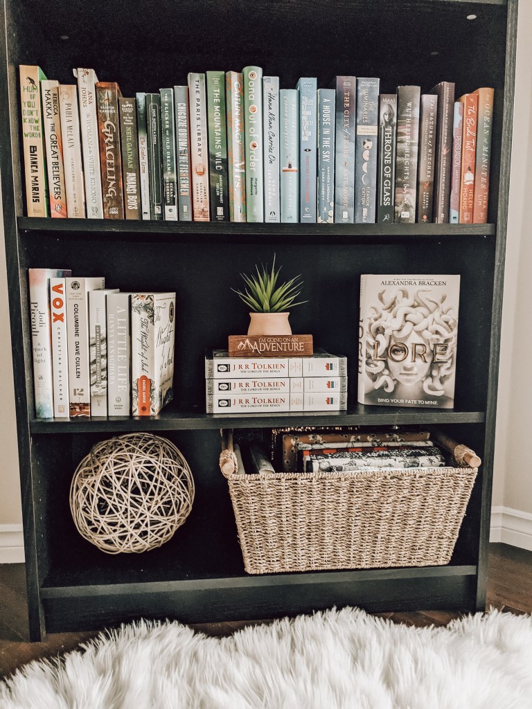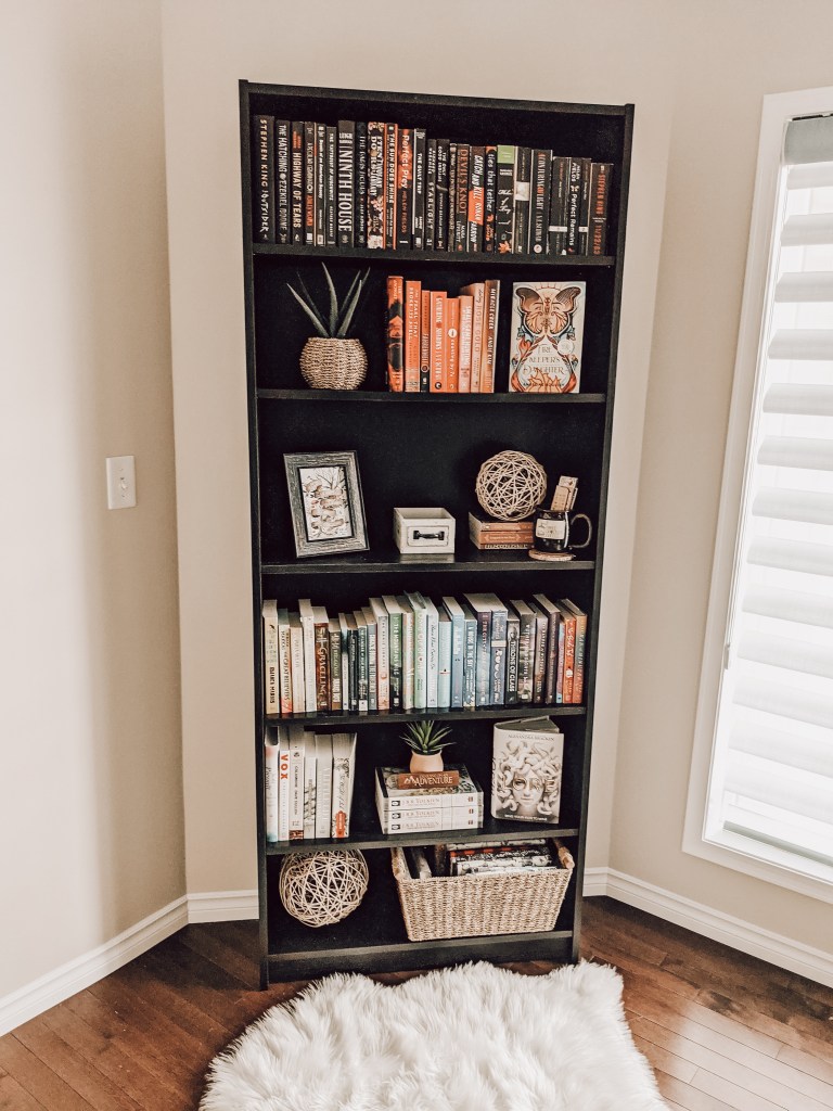 A fun and functional item to add is a basket to hold random things you might need. I filled mine with book sleeves! Another item that I like to include is a mug or two. You can use them to hold smaller bookish items like bookmarks. I even tossed a small rug in front of the bookshelf for maximum comfort while browsing. The possibilities are endless!